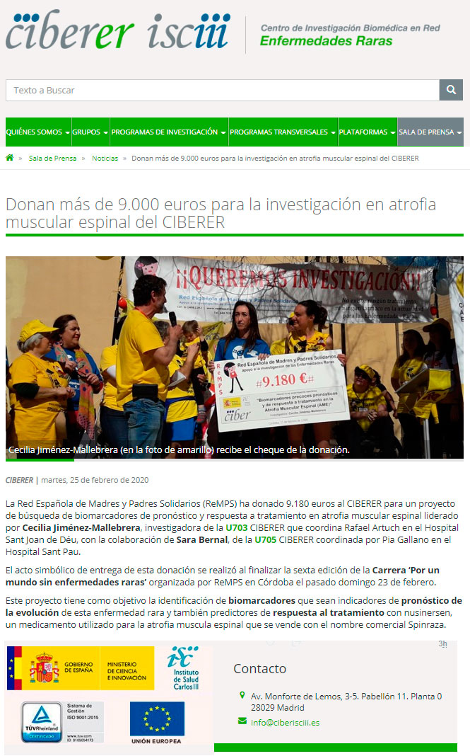 En la llegada a meta 12:20h (Arco del Triunfo), se entregará una donación de 9180€ por la Asociación Red Española de Madres y Padres Solidarios, apoyo a la investigación de Enfermedades Raras (ReMPS) al proyecto de investigación `Biomarcadores precoces pronósticos y de respuesta a tratamiento en la Atrofia Muscular Espinal (AME)´ de la investigadora Cecilia Jiménez-Mallebera, avalado por el Consorcio Centro de Investigación Biomedica en Red, M.P. (CIBER): CIBERBBN, CIBERDEM, CIBERER, CIBERES, CIBERESP,CIBEREHD,CIBEROBN, CIBERSAM, CIBERFES, CIBERONC, CIBERCV. www.ciberisciii.es