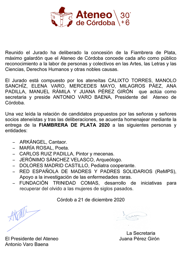 EL ATENEO DE CÓRDOBA CONCEDE EL PREMIO `FIAMBRERA DE PLATA 2020´A ReMPS